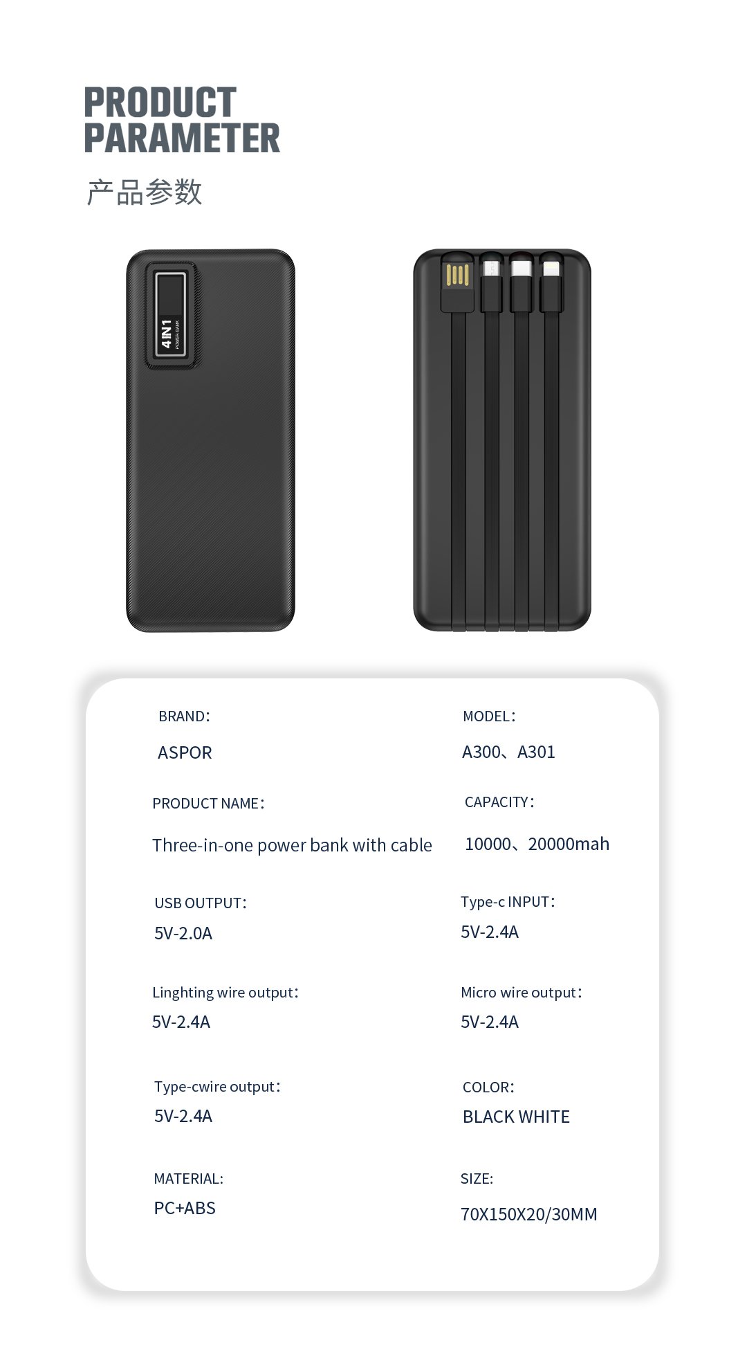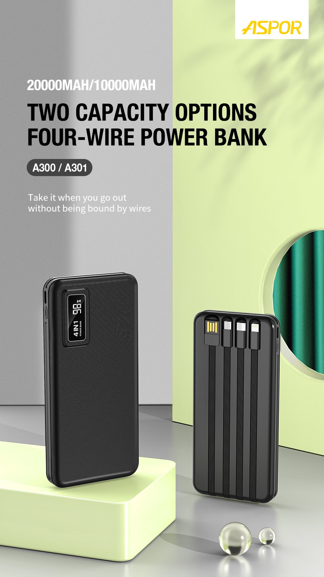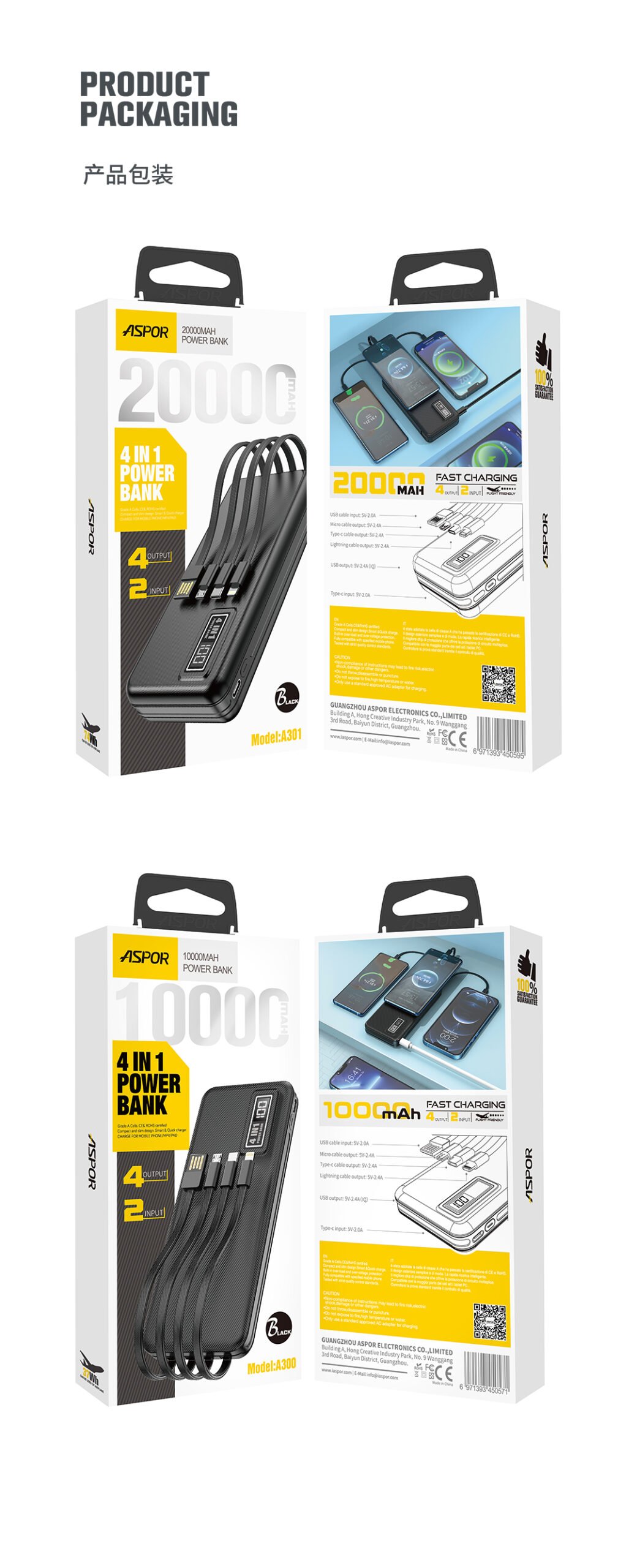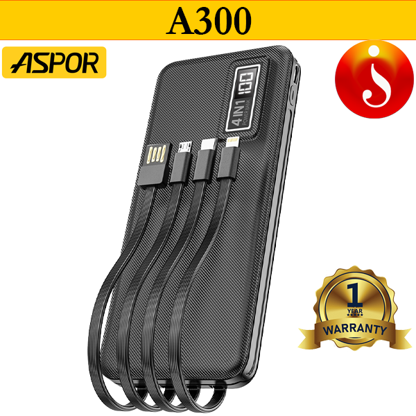 Aspor A300 Power Banks 10000mAh fast Charger 4 In1 Built in Cables Portable Power Station
