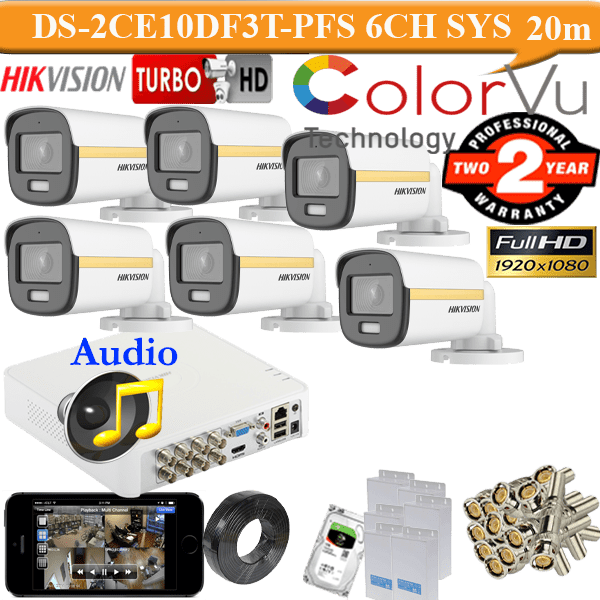 Hikvision 2mp gold colorvu audio 6 camera package ds-2ce10df3t-pfs