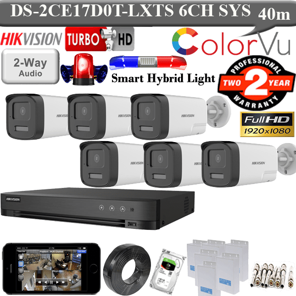 4 Channel Turbo HD DVR Model-DS-7104HQHI-K1- 01Unit 2MP Colorvu WDR, 3DNR, Cameras Model-DS-2CE16DF0T-LPFS 04Units 500GB Hard Disk Drive Option 1TB Hard Disk or 2TB Hard Disk- 01Units 12V-2Amp Power Supply- 4Units 3C2V Video Cable- 100Meters BNC Video connectors- 8Units