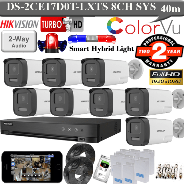 Hikvision 2mp Siren Two-Way Audio Smart Dual-Light 8 camera 40m kit Specification Quantity DVR- Hikvision Turbo HD Voice Recording 8 Channel DVR Model iDS-7208HQHI-M1/XT 1 Camera- Hikvision Colorvu 2MP Two-Way-Audio Camera DS-2CE17D0T-LXTS 8 500 GB Hard Drive 1 2Amp-12Voltage Power Supply 8 Video Connector BNC 16 3C2V Video Cable 200 meters