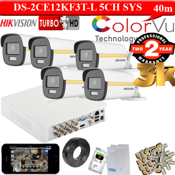 Hikvision 3K-5MP Gold colorvu-Dual light 5 camera 40m kit 1TB HDD Specification Quantity DVR- Hikvision Turbo HD Voice Recording 8 Channel DVR Model iDS-7108HQHI-M1/S 1 Camera- Hikvision Colorvu 5MP 3K Voice Camera DS-2CE12KF3T-L 5 1TB Hard Drive 1 2Amp-12Voltage Power Supply 5 Video Connector BNC 10 3C2V Video Cable 100 meters