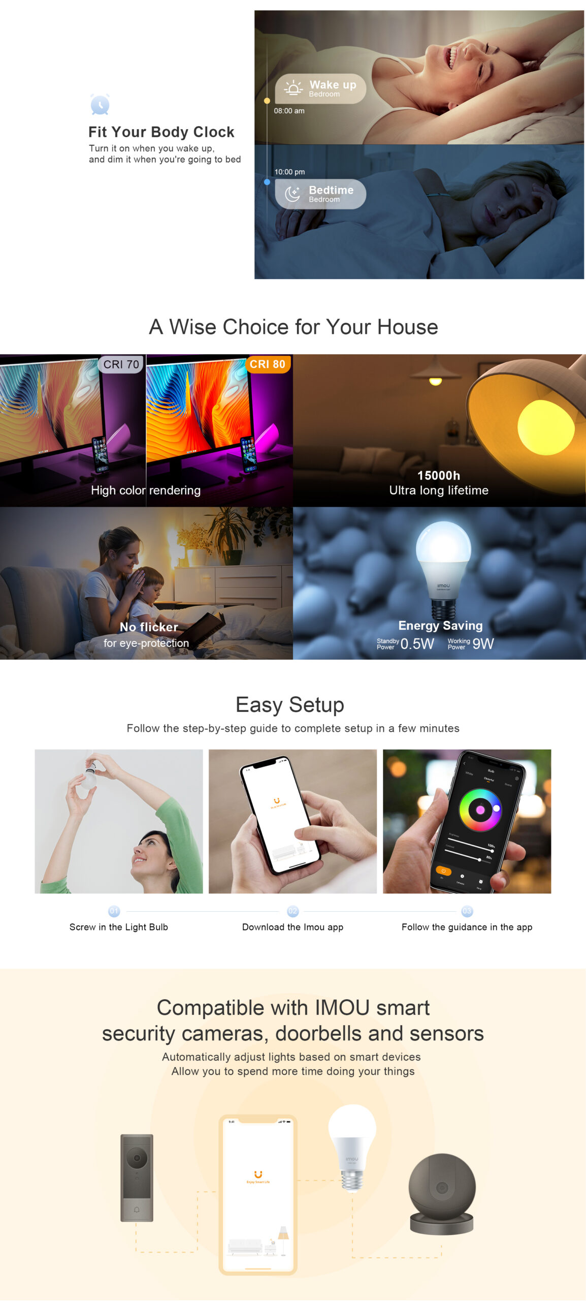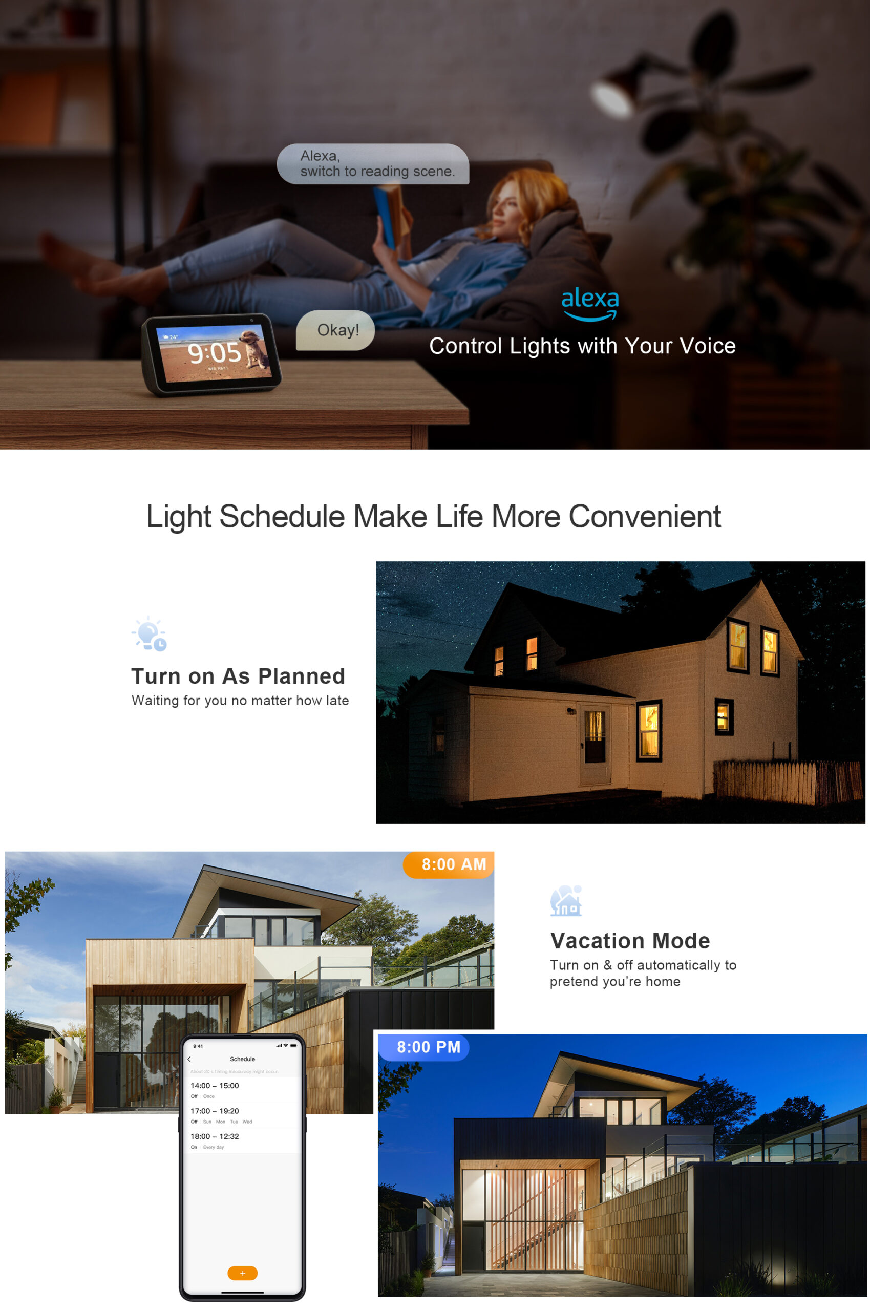 - Time Schedules-Light schedules make life more convenient. A wise choice for your houseHigh color rendering15000h ultra long lifetime.